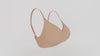 No seam bralette in nude color with thin straps, worn by a model for a smooth and comfortable fit